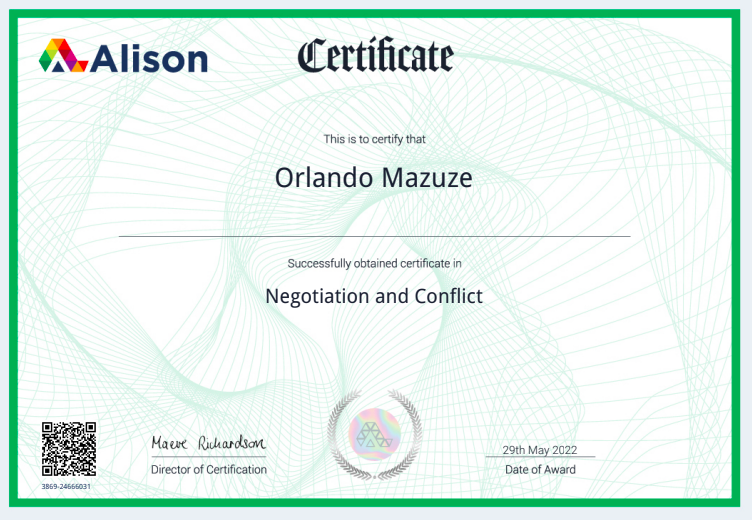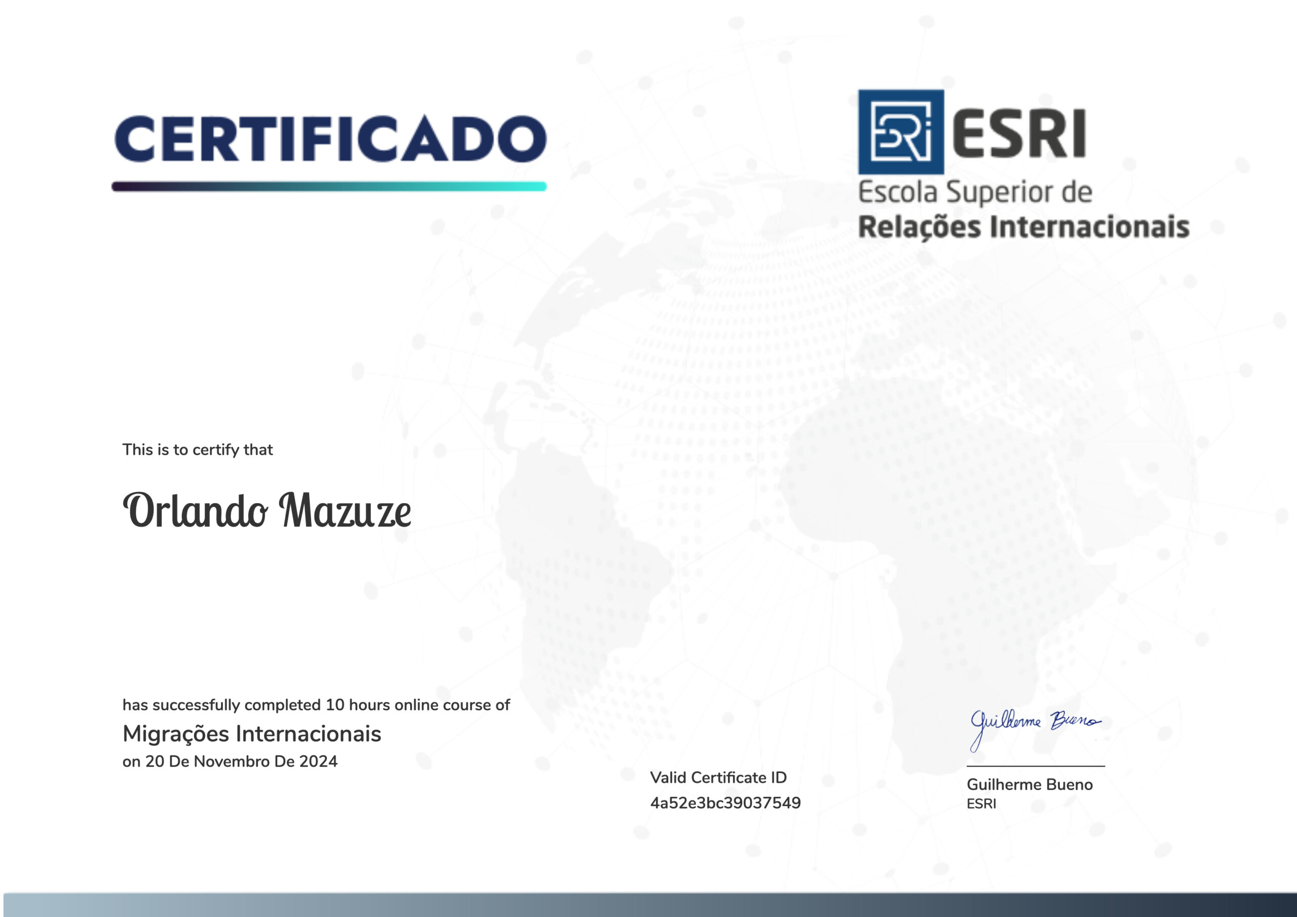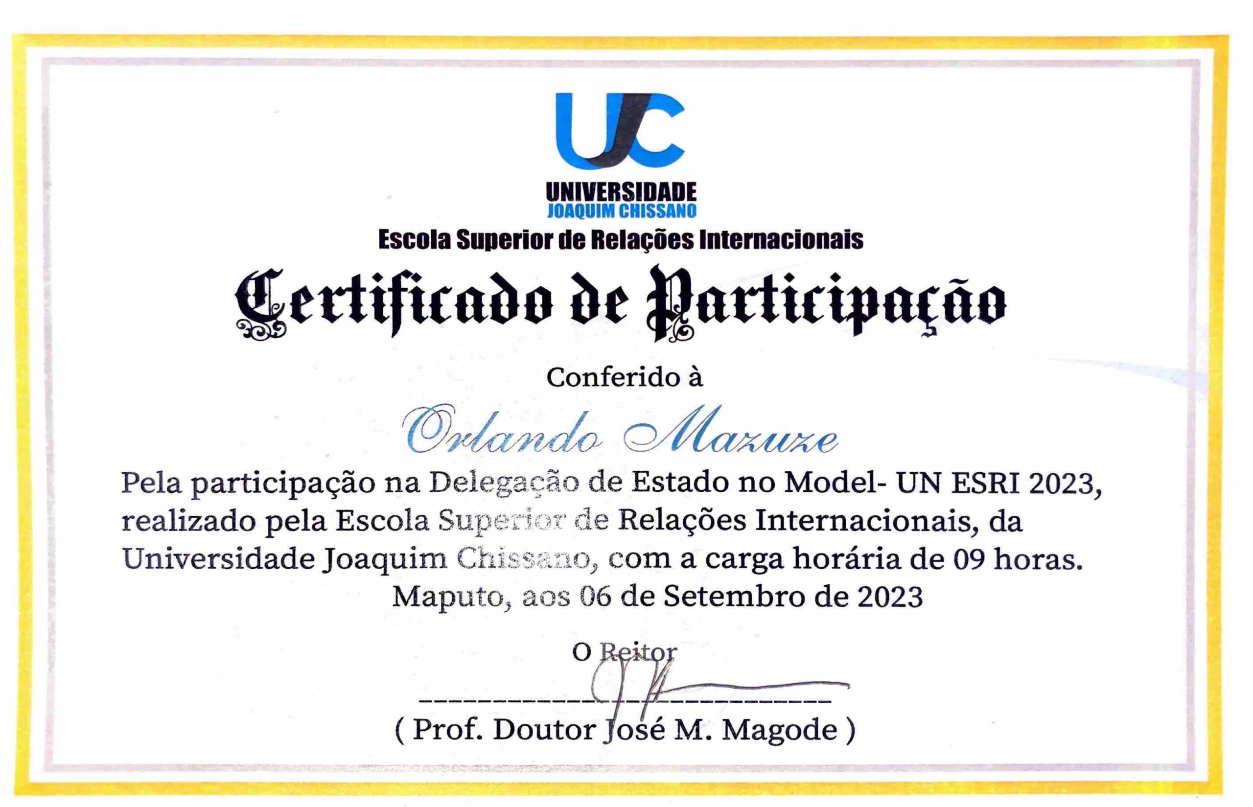 - Técnico Superior de Relações Internacionais e Diplomacia – Universidade Joaquim Chissano;